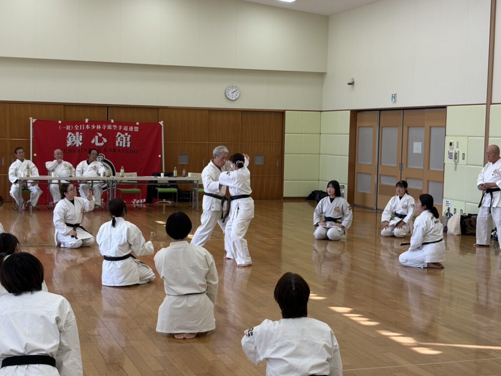 現代社会において注目が高まる護身術の観点から、約束組手二段の稽古も実施。痛みに思わず悲鳴が上がる場面もありましたが、厳しさの中にも和やかな雰囲気が漂い、他道場の拳友との交流を深める貴重な時間となりました。