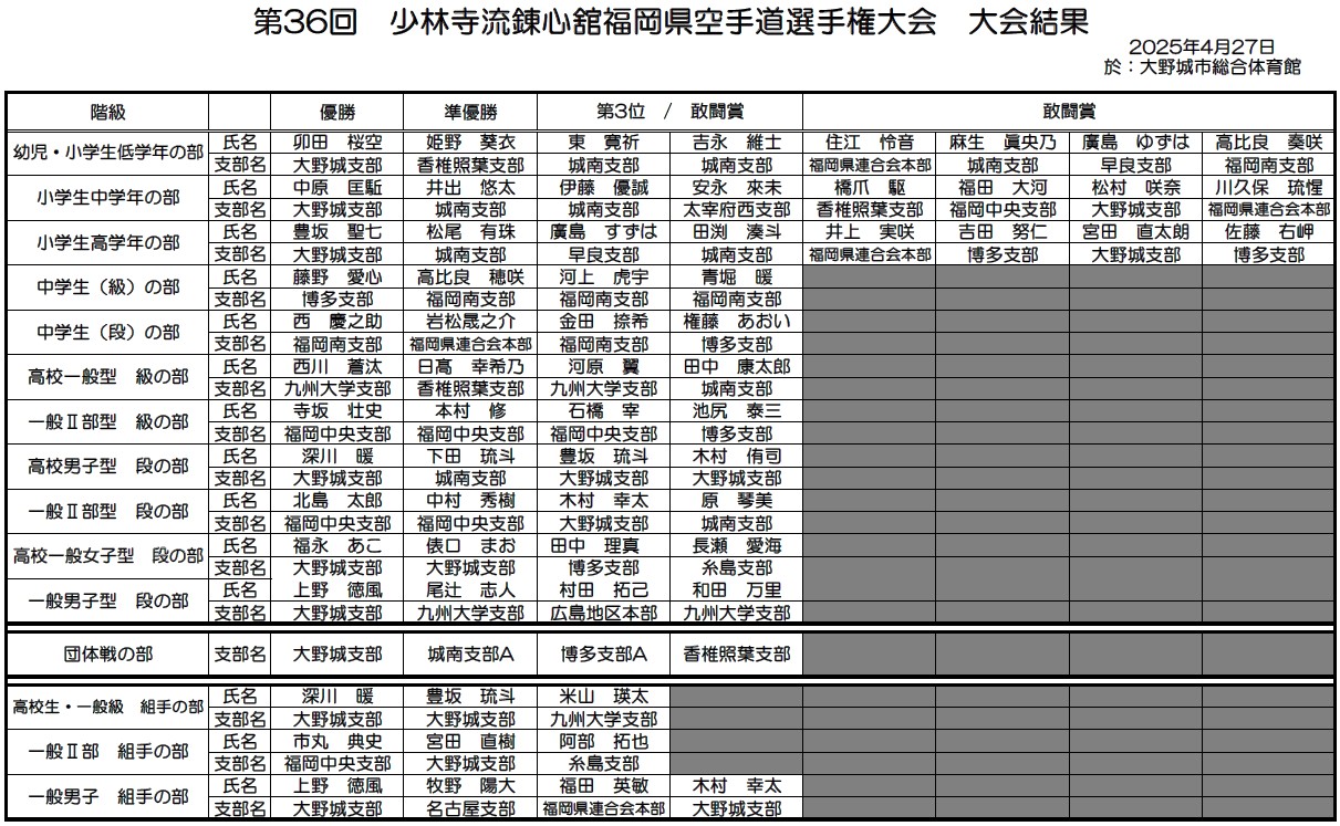 第36回 錬心舘福岡県空手道選手権大会開催結果